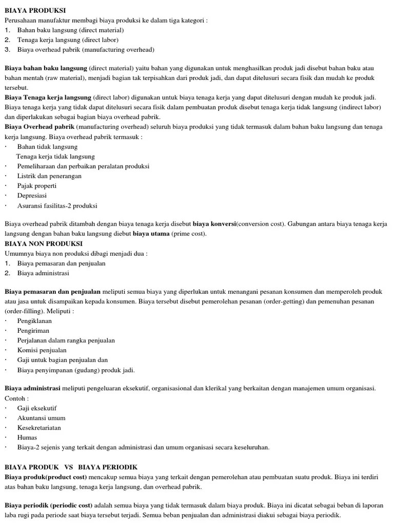 Biaya dalam arti cost adalah jumlah yang bisa diukur untuk mendapatkan barang atau jasa. 12.10.2021 · biaya yang belum menjadi beban pendapatan (biaya) akan tetap melekat pada obyek menjadi aset perusahaan. Biaya produksi jangka panjang, long run cost, dalam jangka panjang, perusahaan dapat merubah atau menambah semua faktor produksi yang digunakannya. Biaya merupakan harga pokok atau bagiannya untuk memperoleh pendapatan ; 29.06.2021 · biaya bahan baku adalah salah satu unsur penting biaya produksi selain biaya tenaga kerja langsung dan biaya overhead pabrik (bop).